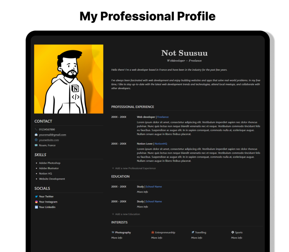 Notion Resume$0+$0+https://schema.org/InStockusdNot SuusuuNot Suusuu6 ratingsNotion Template as your ResumeName a fair price:$Add to cartA Notion ResumeAdd to wishlist New wishlistShareShare on XShare on Facebook Copy linkCopy product URLRatings5(6 ratings)655 stars100%4 stars0%3 stars0%2 stars0%1 star0%